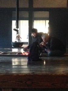 藁葺き屋根の古民家の庭先にむしろを敷いての作業。家の中では囲炉裏に火が起こしてあり、あたりには冬の匂いが漂ってタイムトリップムードは完璧です。